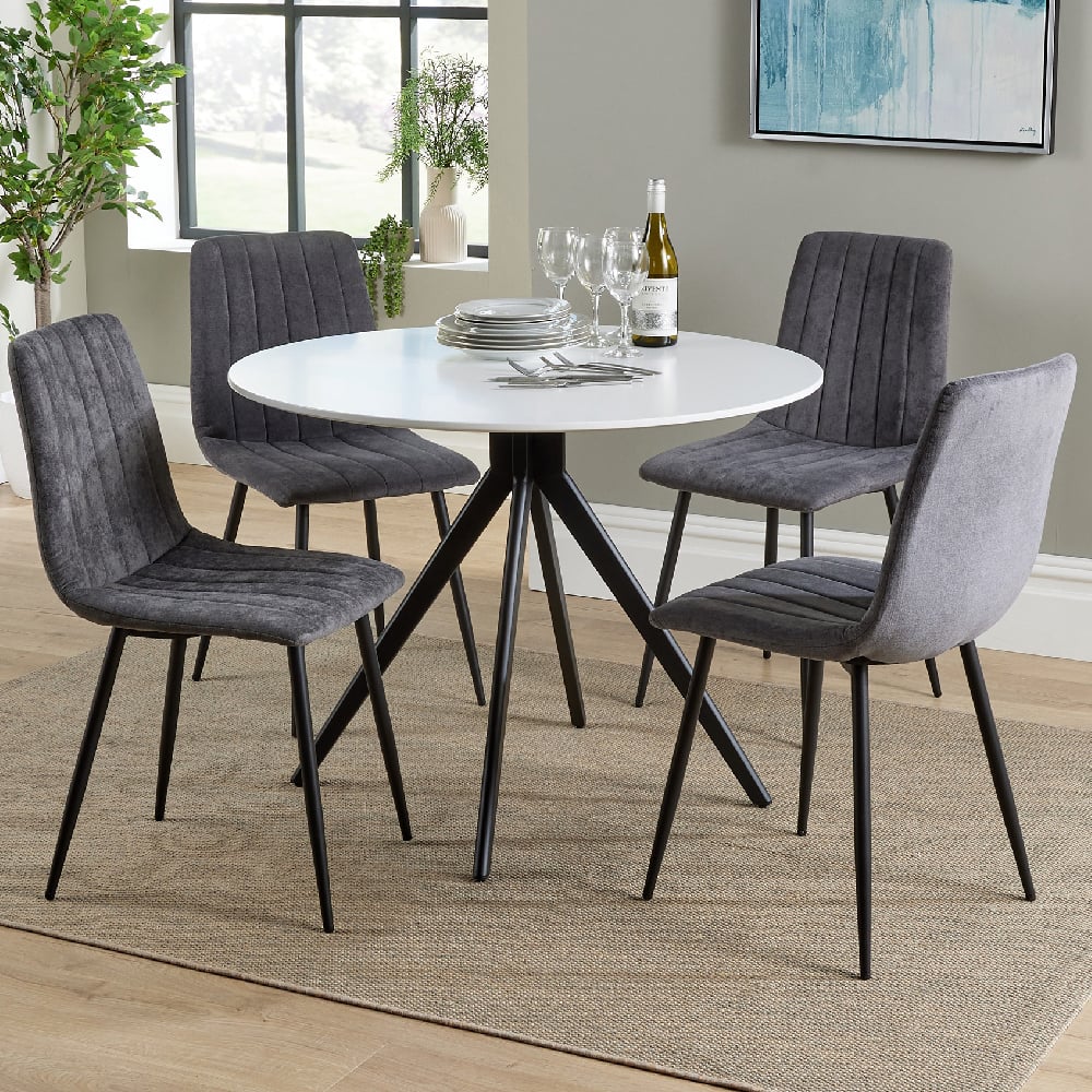 Arta Round White Wooden Dining Table 4 Dark Grey Straight Chairs